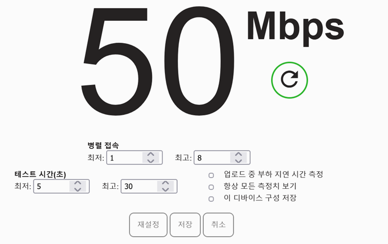 4. 설정을 누르면 지연 시간의 최저값과 최고값, 테스트 진행 시간 등을 선택해서 측정이 가능합니다. 또한 업로드 시 부하가 걸릴 때의 반응 속도 등을 알 수 있습니다. 또 현재 기기의 설정을 저장하거나 초기 상태로 되돌리는 기능도 있습니다.
