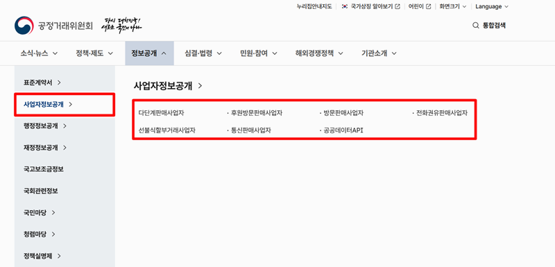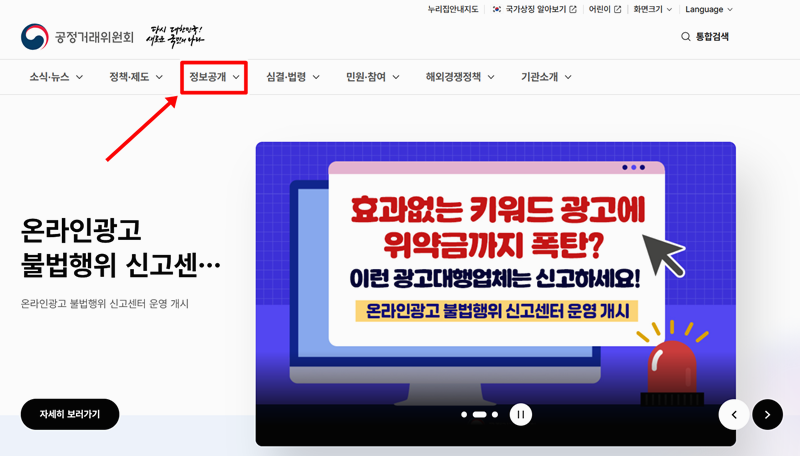 1. 소비자와 기업이 공정한 거래를 할 수 있도록 다양한 정보를 제공하는 곳입니다. 가맹점이나 등록된 업체에 대한 정보도 확인할 수 있어 거래 전에 신뢰할 만한 곳인지 판단하는 데 도움이 됩니다. 또한 불공정 행위나 법 위반 사례에 대한 신고도 할 수 있어 소비자 보호 역할도 하고 있습니다. 상단 카테고리에서 정보공개를 누릅니다.