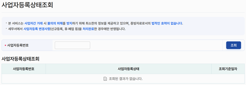8. 사업자등록상태 조회를 누르면 홈택스로 이동 되며 해당 서비스는 사업자 간 거래 시 피해를 예방하기 위해 최소한의 정보를 확인할 수 있는 시스템입니다. 사업자 등록에 대한 변경 사항은 세무서에서 처리 완료된 후에 반영되며 법적 효력은 없습니다 사업자 등록번호를 입력하면 관련 정보를 확인할 수 있습니다.
