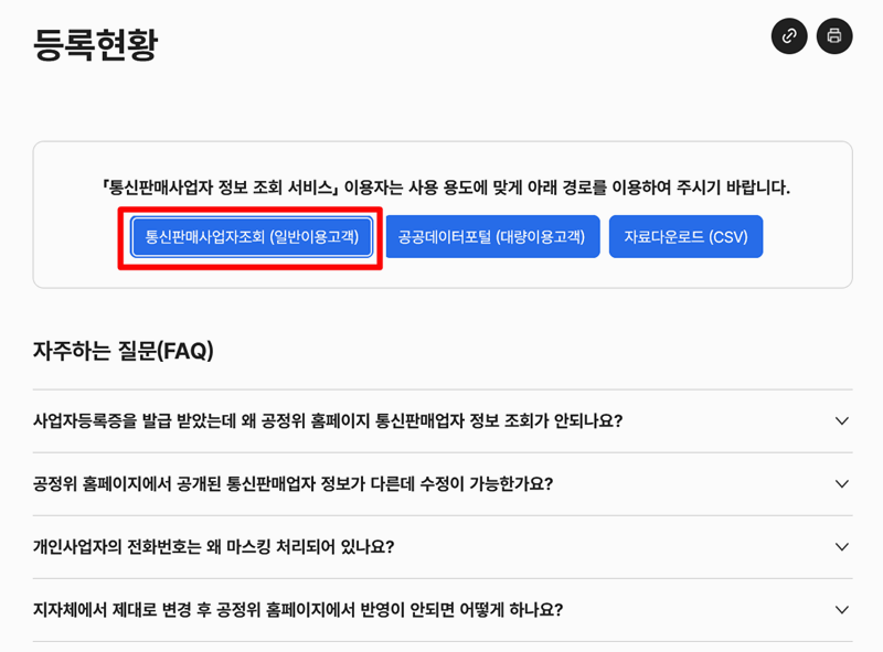 3. 통신판매와 관련된 등록된 업체 정보를 확인할 수 있는 서비스입니다. 필요한 정보는 이용 목적에 따라 개별 조회하거나 대량으로 받을 수도 있습니다. 등록된 업체의 기본적인 정보뿐만 아니라 운영 상태나 기타 관련 내용도 확인할 수 있습니다. 가장 왼쪽의 사업자조회를 선택합니다.
