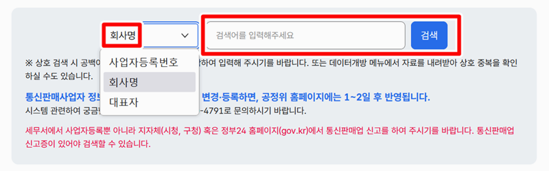 5. 업체 이름을 검색할 때 공백이나 특수문자를 정확히 입력해야 하며 중복 여부는 데이터 개방 메뉴에서 확인할 수 있습니다. 왼쪽 칸에서 회사명을 선택한다음 검색어를 입력하고 검색합니다.