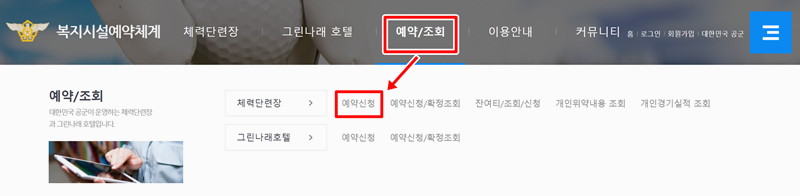 5. 예약/조회 카테고리에서 체력단련장 예약신청을 통해서 체육시설 예약이 가능하며 예약 시에는 로그인이 필요하므로 회원가입 후 예약을 하실 수 있습니다.