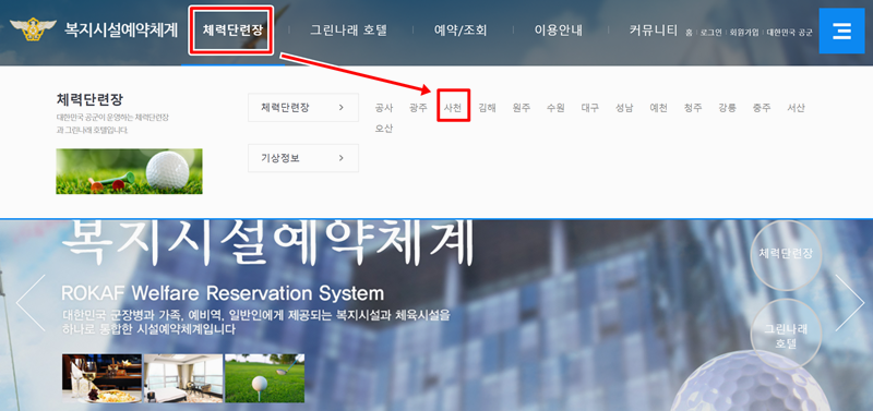 1. 공군 복지 시설을 편리하게 예약할 수 있는 공간이에요. 이용 가능한 시설을 확인하고 원하는 날짜에 맞춰 예약할 수 있어서 시간을 절약할 수 있어요. 공군 관계자들이 복지 시설을 더욱 쉽게 활용할 수 있도록 만들어진 곳이에요. 상단에 카테고리 중 체력단련장의 사천을 선택합니다.