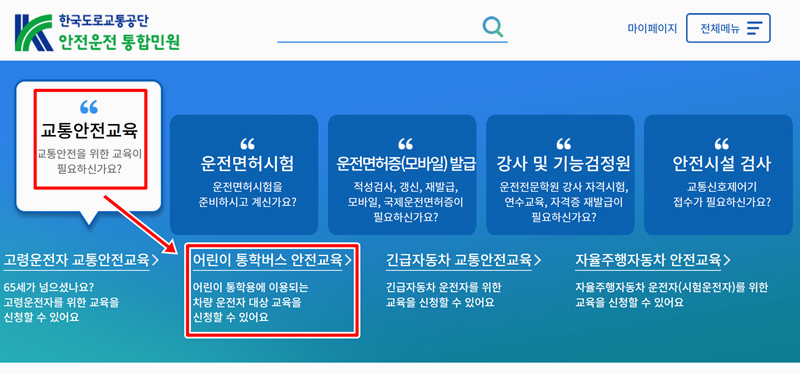 1. 통학버스 운전자나 보호자가 교육을 받을 수 있는 곳이에요. 온라인으로 교육 신청과 이수가 가능하며 어린이 안전을 위한 다양한 정보도 볼 수 있어요. 필요한 사람들은 도로교통공단 안전교육센터 사이트에서 확인하면 돼요. 교통안전교육의 어린이 통학버스 안전교육으로 들어갑니다.