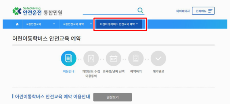 5. 어린이통학버스 안전교육 예약 페이지로 들어오면 이용안내를 확인한 후 개인정보 동의, 교육장과 날짜 선택, 예약하기 단계를 거쳐 예약을 완료할 수 있어요. 일정이 궁금하면 일정보기를 눌러 확인하면 돼요.