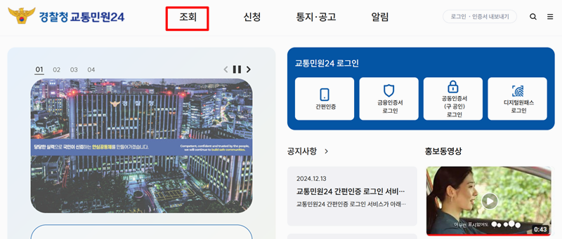 1. 이파인은 각종 교통 관련 민원을 처리할 수 있는 공식 누리집이에요. 경찰청교통민원24 이파인 누리집에 들어가면 상단에 여러 메뉴가 보이는데 그중에서 조회라는 글자에 마우스를 살짝 올려주면 숨겨진 항목들이 나타납니다.
