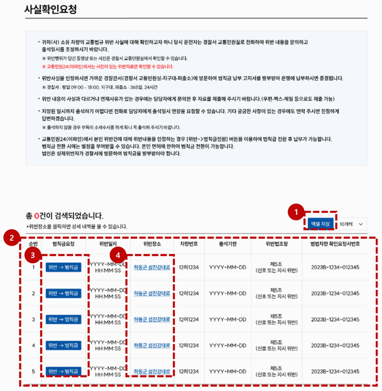 4. 로그인 후엔 무인카메라로 찍힌 단속 내용이 정리돼 나와요. 날짜, 장소, 차량번호, 위반 사유, 경찰서 정보까지 한 번에 확인할 수 있어요.