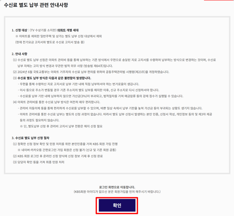 6. 화면에 안내된 글을 먼저 읽어보시고 하단에 있는 확인을 선택합니다. 이후 로그인하시면 수신료 해지 신청을 마무리할 수 있습니다. 어렵지 않게 끝낼 수 있습니다.