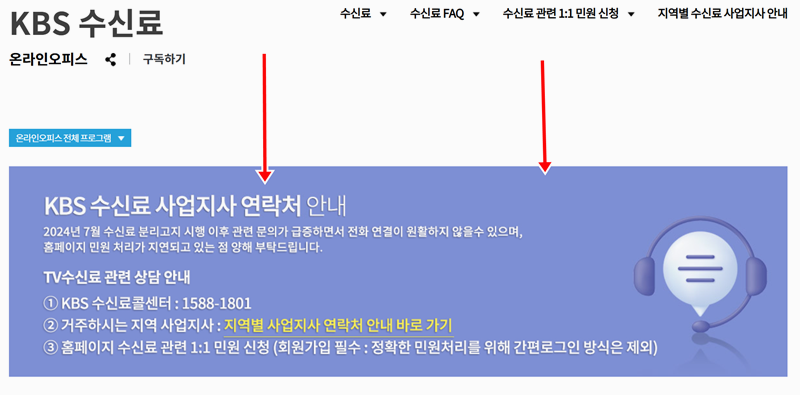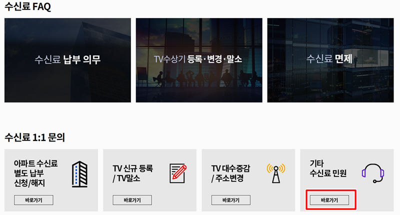 3. 그러다 보면 '수신료 1:1 문의'라는 문구가 보이고 그 밑에 '기타 수신료 민원'으로 넘어가는 안내가 있습니다. 바로가기를 선택해주세요.