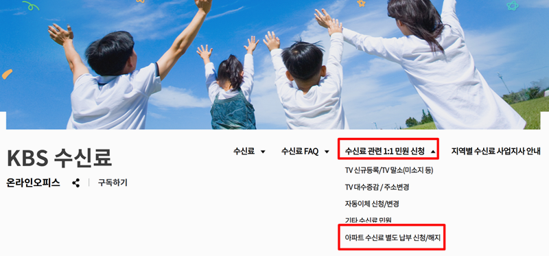 5. 아파트에 사시는 경우에는 별도 절차가 필요할 수 있어요. 화면에 보이는 '수신료 관련 1:1 민원 신청' 항목을 찾으신 후 '아파트 수신료 별도 납부 신청/해지'라고 쓰인 부분으로 들어가면 다음 단계를 이어서 진행할 수 있어요.