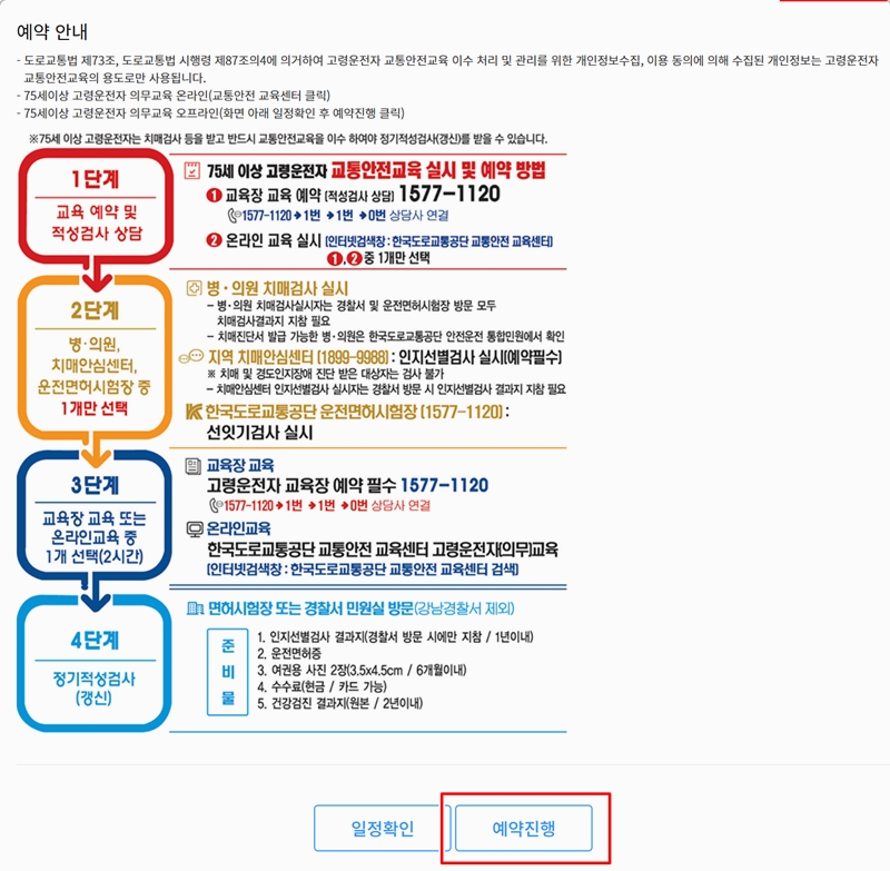 3. 고령운전자 교통안전교육은 65세 이상 어르신을 위한 과정이며 75세 이상부터는 반드시 교육을 받으셔야 합니다.전국에 있는 도로교통공단 교육장에서 고령운전자 교통안전교육을 들을 수 있어요. 75세 이상 어르신의 경우 온라인 교육은 관련 센터에서 신청하실 수 있고 오프라인은 일정 확인 후 신청 절차를 진행하시면 됩니다. 확인 후 예약 진행을 누릅니다.