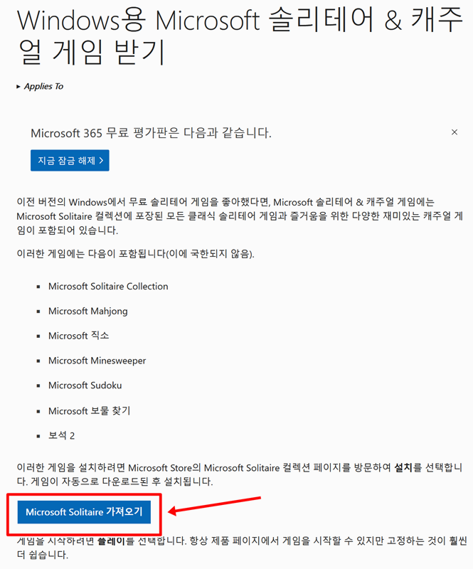1. 예전에 컴퓨터로 자주 하던 솔리테어가 그리웠다면 지금이 딱 좋은 기회예요. 다양한 게임이 담긴 마이크로소프트 게임 컬렉션을 쉽게 설치해서 다시 즐길 수 있어요. 아래에 있는 Microsoft Solitaire 가져오기를 눌러주세요.