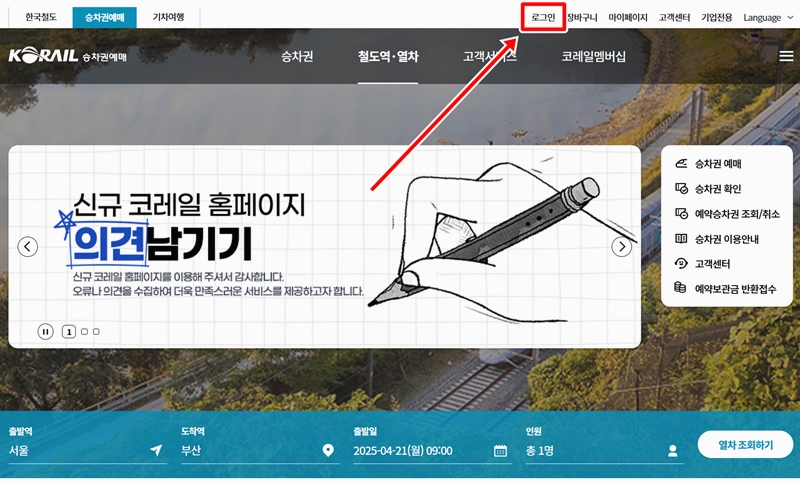1. 기차를 예약하거나 시간표를 확인할 수 있는 공간으로 열차 이용을 보다 편리하게 도와주는 온라인 창구 같은 곳입니다. 회원가입을 위해 상단에 있는 로그인이라는 글자를 찾아 눌러주세요. 눈에 잘 띄는 위치에 있어서 어렵지 않게 찾으실 수 있습니다.