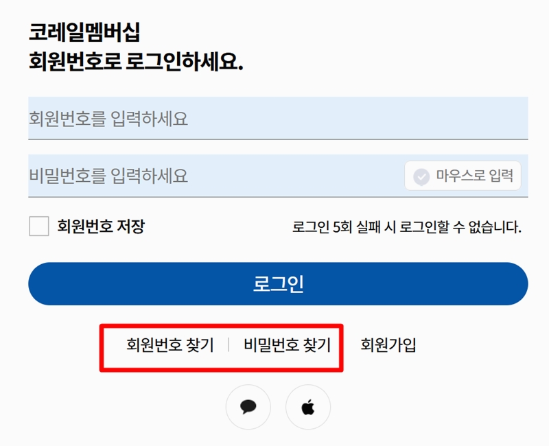 6. 아이디나 비밀번호가 생각나지 않으실 땐 당황하지 마시고 회원번호/비밀번호 찾기 서비스를 통해 본인의 이름과 가입할 때 입력했던 휴대전화 번호를 입력해보세요. 그럼 등록된 정보를 바탕으로 회원번호를 다시 확인하실 수 있습니다.