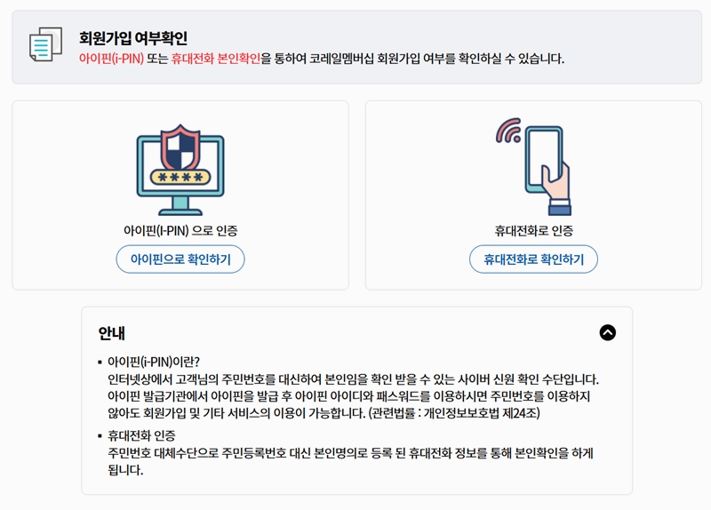 4. 이제 본인인증을 진행합니다. 본인 확인은 아이핀 또는 휴대폰을 통해 할 수 있으며 약관 동의 및 개인정보(비밀번호와 연락처, 이메일 수신 여부) 등을 빠짐없이 입력하고 가입을 완료 합니다.