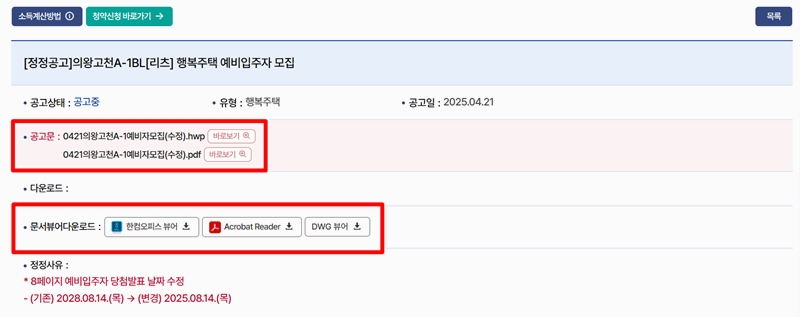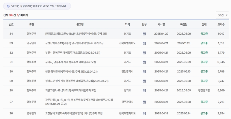 3. 조건을 설정한 후 검색을 누르면 선택한 지역에 해당하는 입주자 모집 공고들이 나와요. 필요한 공고를 확인할 수 있습니다.