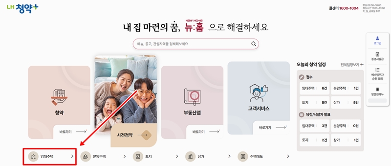 1. 국민임대아파트를 비롯해 다양한 공공주택 정보를 확인하고 신청까지 할 수 있는 곳이에요. 집과 관련된 정보를 한눈에 볼 수 있어 정말 편리하답니다. 메인 화면에 들어가면 다양한 메뉴가 있는데요. 그중에서 좌측 하단 임대주택을 찾아서 이동합니다.