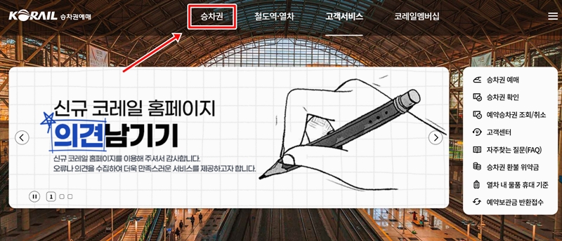 2. 코레일 승차권 예매 홈페이지에 들어가면 상단 메뉴가 쭉 나옵니다. 이 중에서 승차권 항목을 누르면 예매, 반환, 열차 시간표 같은 여러 메뉴가 한눈에 보여요. 여기서 예매 메뉴를 골라주면 본격적인 기차표 예약 절차가 시작됩니다.