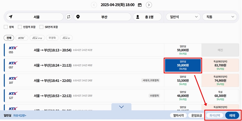 4. 조회가 끝나면 선택한 날짜의 KTX 열차 목록이 쭉 뜹니다. 열차 번호, 출발 시간, 요금도 같이 확인할 수 있어요. 여기서 일반실이나 특실 중 원하는 객실을 고르고, 좌석 선택으로 넘어가 예약을 이어가면 됩니다.