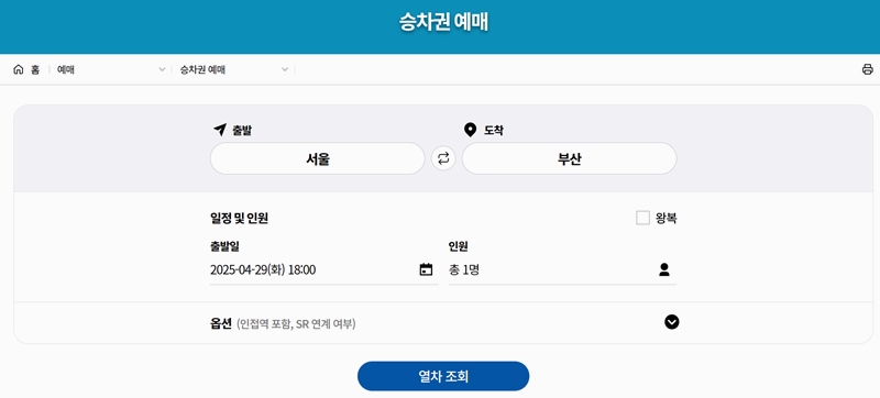 3. 예매 화면으로 들어가면 출발지와 도착지, 날짜와 인원 수를 입력할 수 있어요. 그리고 원하는 열차 종류나 좌석 조건을 선택해두면 더 정확하게 조회가 가능해집니다. 입력을 다 했으면 열차 조회 버튼을 눌러 다음 단계로 넘어가면 돼요.