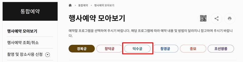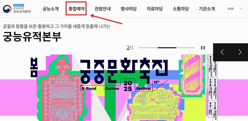 1. 문화재청이 운영하는 공식 홈페이지에요. 덕수궁뿐만 아니라 경복궁, 창덕궁, 창경궁, 종묘, 조선왕릉까지 관람 일정과 예약 정보를 한눈에 볼 수 있어요. 상단에 있는 통합예약 메뉴로 들어가면 관람 신청을 바로 진행할 수 있어요.