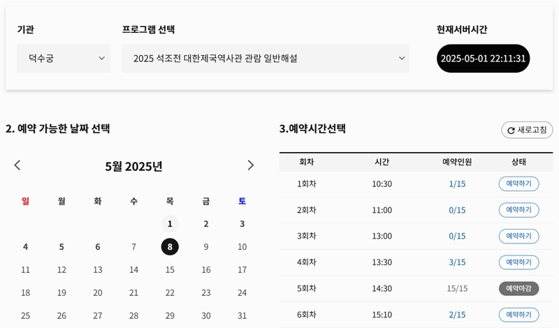 4. 날짜와 시간 고르는 게 제일 중요한데요. 석조전은 인기가 많아서 보통 일주일치 예약이 꽉 차 있어요. 원하시는 날짜가 있다면 미리미리 달력 보고 가능한 날짜부터 먼저 확인해보세요. 가능한 날짜에 예약이 열려 있어요.