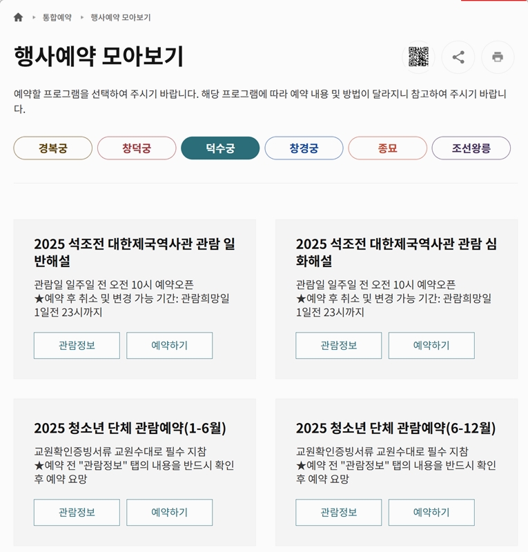 9. 입장료도 함께 확인할 수 있는데 덕수궁은 개인 1,000원, 단체 800원이에요. 관람 대상은 만 25세부터 만 64세까지 가능해요. 요금이 저렴해서 부담 없이 다녀오기 좋고 나이 제한도 있어서 미리 확인해두면 좋아요.