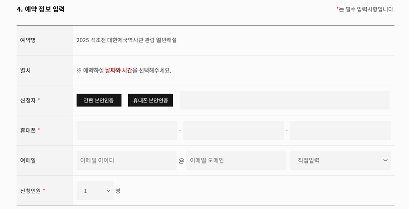 5. 신청자 이름과 휴대폰 번호를 입력하고 본인인증을 해야 예약이 가능해요. 그리고 같이 갈 인원 수까지 선택할 수 있어요. 이때 숫자 잘못 입력하면 예약이 엉뚱하게 될 수 있으니까 꼭 한 번 더 확인해보는 게 좋아요.