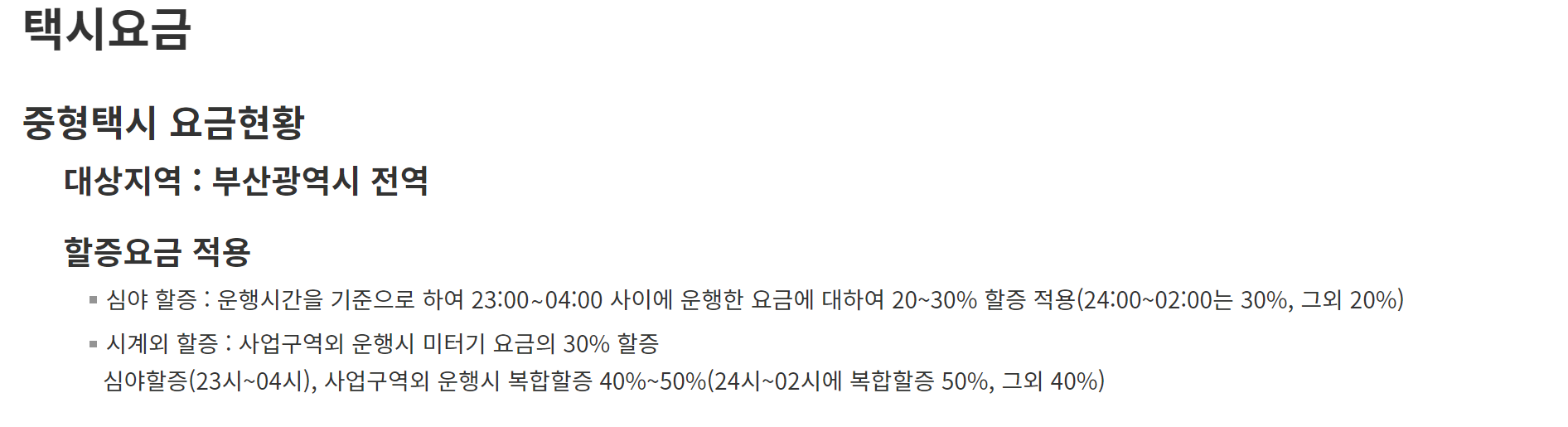3. 부산광역시에서 운영하는 중형택시, 모범택시, 관광택시의 기본요금과 할증 내용이 정리되어 나와있습니다. 중형택시 대상 지역은 부산광역시 전역 입니다.