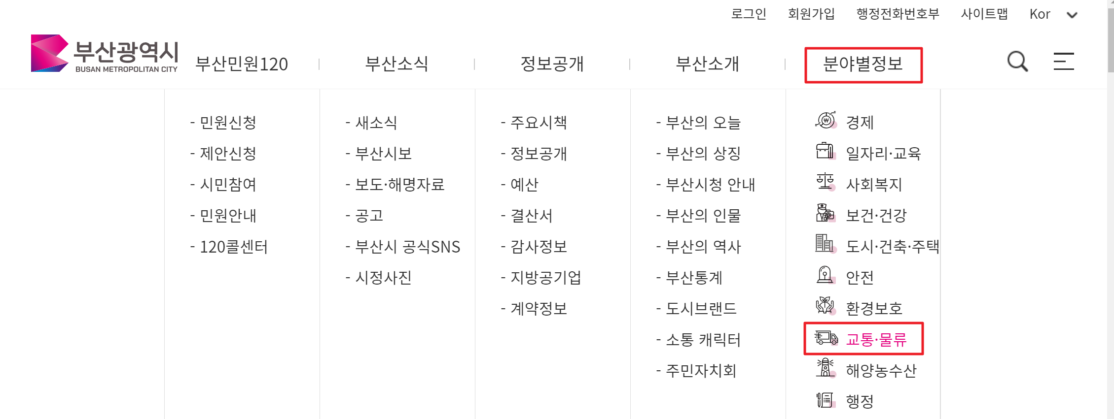 1. 상단 메뉴에서 분야별정보의 교통·물류로 들어갑니다.