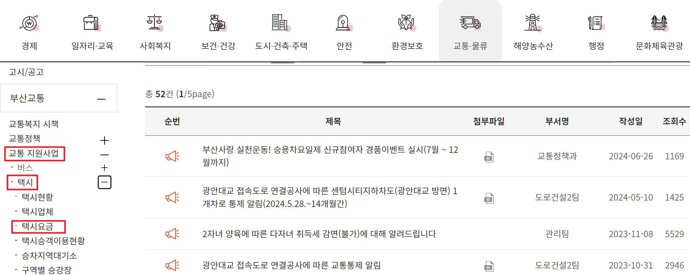 2. 그리고 왼쪽의 카테고리에서 ‘부산교통->교통 지원사업->택시요금’으로 이동합니다.