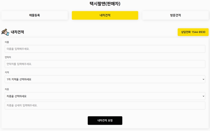 4. 내차 견적 확인도 가능합니다. 이름 연락처 지역 차종 등을 선택하고 내차견적 요청을 하면 택시 매매와 관련된 가격을 알아볼 수 있습니다.