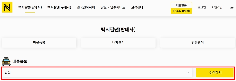 2. 택시팔땐(판매자) 메뉴에서는 매물등록 내차견적 방문견적 등의 항목을 선택할 수 있습니다. 매물 목록에서 지역을 인천으로 선택한 후 검색하면 인천 지역의 매물을 확인할 수 있습니다.