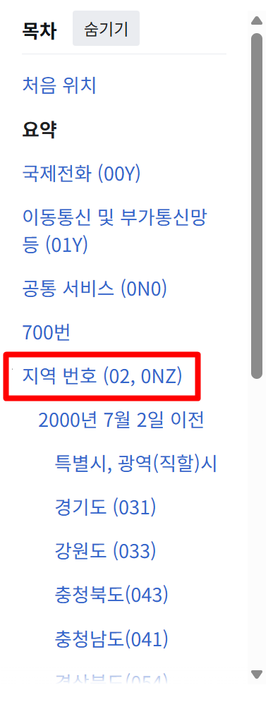 2. 페이지 왼쪽에는 보기 쉽게 목차가 정리돼 있습니다. 국제전화 00Y, 이동통신과 부가통신망 01Y, 공통 서비스 0N0와 함께 지역번호 02, 0NZ도 확인할 수 있습니다. 이 목록을 통해 각 전화번호 체계가 어떻게 나뉘는지 한눈에 알 수 있어 편리합니다. 평소 궁금했던 번호 구분도 이 목차를 보면 쉽게 확인할 수 있어서 알아두면 쓸모가 많습니다.